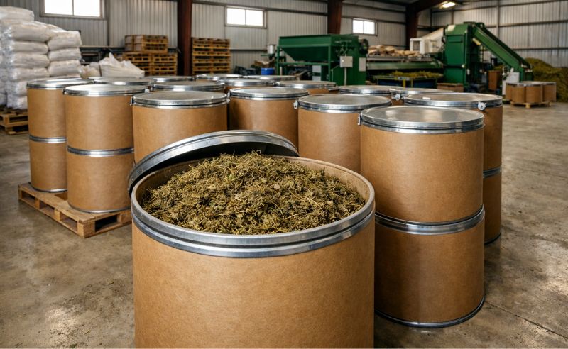 La elección del recipiente depende del volumen de producción y del sistema logístico. En muchas instalaciones se utilizan bidones de cartón porque ofrecen una estructura ligera y resistente que facilita el almacenamiento y el transporte del material vegetal.