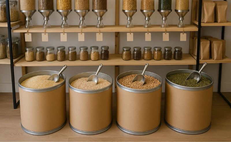 In many urban shops, space is limited and the product range changes rapidly. The lightweight Kraft drum allows it to be moved around, reorganising the bulk area and adapting it to new products effortlessly. This flexibility is key when there are seasonal products or frequent rotations.